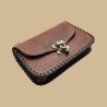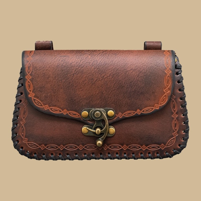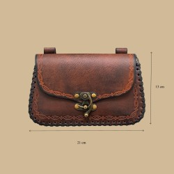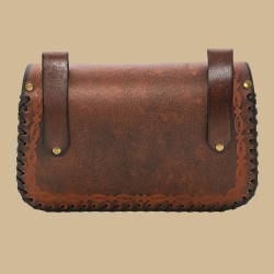 Medieval inspired pouch in brown leather with embossed outline.Black leather strap edging.